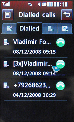 Список вызовов. В аппарате имеются списки входящих, исходящих и пропущенных вызовов, кроме этого, имеется общий список всех вызовов. В первых трех может храниться до 40 номеров, в общем же списке - до 120. Вызовы на одинаковые номера объединяются только в том случае, если они были сделаны подряд, тогда рядом с номером (именем) появляется число сделанных попыток, а в детальной информации можно увидеть время и дату для каждого из звонков. Для каждого вызова отображается имя абонента (если оно есть в телефонной книге) и дата, а в детальной информации появляется номер абонента, время вызова и его продолжительность.