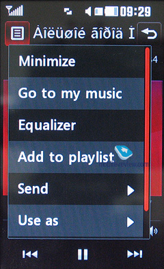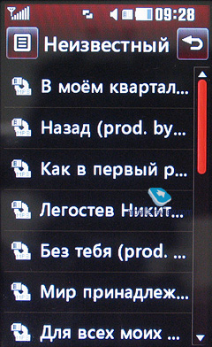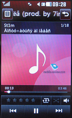 ![]() MP3-плеер. Телефон поддерживает следующие типы музыкальных файлов: MP3, AAC, AAC+ и WMA. В плеере имеется сортировка композиций по исполнителям, альбомам и жанрам. Кроме этого, присутствует общий список всех композиций, а также их случайное воспроизведение из этого списка. Также пользователь может создавать собственные плей-листы. Телефон без труда работает с русскоязычными тегами, правда вот только когда меню аппарата на русском языке, если оно на английском, то теги отображаются некорректно. Конечно, проигрыватель умеет работать в фоновом режиме, а вся информация отображается в соответствующем виджете. В плеере имеется 8 предустановленных настроек эквалайзера, таких, как: обычный, классика, джаз, поп, рок, концертный зал. Телефон проигрывает музыку вполне хорошо, качество, конечно, не самое высокое, но вполне приемлемое для телефона. Громкость воспроизведения также хорошая, ее вполне хватает для комфортного прослушивания плеера в метро, правда, без запаса по громкости. При воспроизведении музыки через динамик качество будет не очень, как, впрочем, и громкость, сказывается то, что звук в телефоне выводится через разговорный динамик, так как отдельного динамика для этих целей не предусмотрено.
