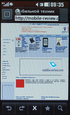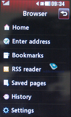 Браузер. В аппарате установлен достаточно хороший браузер, который позволяет просматривать не только wap, но и обычные интернет-страницы. Масштабировать страницы при просмотре в браузере можно просто прикосновением к экрану. Также в браузере предусмотрена загрузка RSS-каналов. Скорость работы браузера достаточно высокая, но, конечно, все зависит от скорости передачи данных. В целом, если у вас безлимитный трафик, то об использовании Opera mini вполне можно забыть, так как предустановленный браузер ничуть не хуже в работе. В браузере телефона задействован датчик движения, так что для просмотра страниц, например, в альбомном режиме, достаточно просто повернуть аппарат.