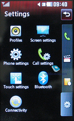 Главное меню в телефоне делится на четыре вкладки, переход между которыми возможен с помощью боковой панели. В отличие от старшей модели в KP500 имеются два вида боковых панелей, которые можно менять через меню настроек. Первый вид аналогичен таковому в Ренуаре, то есть реализован в виде закладок, второй вид схож по оформлению, но кроме нажатий по нему можно перемещаться еще и с помощью пролистываний. В каждой вкладке пункты меню выводятся в виде матрицы 2х4, опять же, в отличие от старшей модели, в KP500 вы не можете перемещать пункты меню между вкладками и даже в ее пределах. Подменю в телефоне представлено в виде вертикальных списков. Главное меню аппарата анимировано, а перемещения по нему происходят без каких-либо видимых притормаживаний.