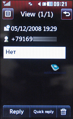 Есть в телефоне и функция быстрого набора 8 номеров. Контакт, помещенный в ячейку быстрого набора, будет отображаться вместе с миниатюрой фотографии (если она, конечно, была присвоена контакту), а также в нижней части ячейки будут отображаться первые буквы имени (всего помещается 9 букв). Короткое нажатие на ячейку увеличивает, выделяет ее, и по бокам появляются вкладки для голосового вызова, редактирования информации, отправки сообщения и удаления контакта. ![]() В телефонной книге можно сделать резервную копию телефонной книги на карту памяти. При входящем и исходящем вызове изображение, присвоенное контакту, будет отображаться в виде крошечной миниатюры. ![]() Сообщения. В памяти аппарата может храниться до 500 текстовых сообщений. Аппарат умеет работать с SMS-сообщениями, но вот поддержки EMS-сообщений в нем нет. В телефоне предустановленно 10 текстовых шаблонов, которые пользователь может менять на свое усмотрение. Также имеется набор смайликов, которые пользователь может пополнять самостоятельно. Поддерживается работа со склеенными сообщениями, при отправке максимальное число символов не может превышать 800. Аппаратом поддерживается мультирассылка сообщений максимум на 10 номеров. Номера забиваются в выделенном поле на том же экране, где и текст сообщения.