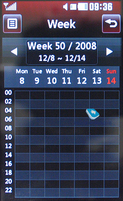Органайзер. Здесь располагается календарь с возможностью просмотра за месяц, неделю и день. В календаре можно создавать до 500 событий, для каждой возможно выбрать категорию, выбрать дату и время начала и окончания события, записать заметку и адрес. Также возможно включить оповещение о наступившем событии, а также активировать его повтор. Также в телефоне может храниться до 500 задач, для каждой из которых вы выбираете дату, делаете текстовую заметку и выставляете приоритет.