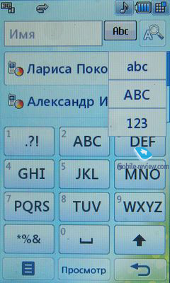 Последним полем является место для заметки на 62 символа. После ввода полной информации предлагается назначить основной номер. Интересная ситуация сложилась с присвоением персональной картинки абоненту. Если делать снимок через меню контактов, он автоматически получится размером 152х160 точек, аналогична ситуация, если воспользоваться редактором в телефоне. Если же для изображения использовать аватар, картинка будет занимать половину экрана. Если контакту не присвоена картинка или аватар, он автоматически будет использовать изображение при исходящем вызове, выбранное в настройках экрана. Смешное же во всем этом то, что если не тратить свое время на подгонку изображения под «нужный» размер, а просто присвоить любой из имеющихся в памяти снимков, он тоже будет отображаться на пол-экрана. Почему так происходит – мы не смогли выяснить, но можем сказать точно одно: лучше всего изображение не обрезать, а просто взять любое готовое и присвоить его абоненту. Объем изображения и его разрешение при этом не играют роли. При просмотре информации о каком-либо из контактов можно сразу же перейти к соседнему нажатием на иконки Влево или Вправо. В режиме просмотра отображаются все заполненные поля, включая картинку, присвоенную абоненту. Поиск контактов можно осуществить несколькими способами. По умолчанию список контактов открывается разделенным на группы контактов, отсортированные по алфавиту, от буквы А до Ж, от З до М и так далее, если же нажать последнюю иконку, отобразятся все контакты из телефонной книги. Второй способ вызывается при нажатии на лупу в правом верхнем углу – традиционный список контактов с буквенной клавиатурой для поиска. В поле поиска можно ввести до сорока знаков, включая неограниченное количество пробелов, в случае если контакту присвоена не только фамилия, но и отчество.