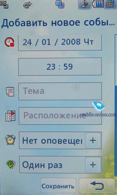 В настройках календаря можно выбрать режим отображения – понедельное или весь месяц, и время начала трудовой недели – воскресенье или понедельник. К нашему большому удивлению теперь пользователи не могут выбрать персональную мелодию для звукового уведомления. Зато любое из событий можно отправить в сообщении (SMS, MMS, Email) или посредством Bluetooth. При просмотре событий конкретной даты можно воспользоваться выделением для удаления нескольких записей. Тот, кому может понадобиться сделать резервную копию календаря или напоминаний, может воспользоваться возможностью резервного копирования с выбором памяти, куда будет сохранен файл – внутренняя или внешняя память. Через то же меню можно восстановить сохраненные данные. Для Встречи можно установить дату и время начала и окончания, добавить описание (138 знаков), место проведения, а также указать время срабатывания сигнала: конкретное, за 15, 30, 60 минут или 1, 3, 7 дней. Повтор сигнала может быть установлен на одноразовое срабатывание, ежедневное, еженедельное, ежемесячное, ежегодное или по желанию пользователя – ежедневно, еженедельно, тип месяца 1 или 2, тип года 1 или 2. Для каждой из персональных настроек предусмотрены еще отдельные, где можно указать, что это будет каждый второй вторник месяца или каждый, например, 77 день года и т.п. Последнее поле позволяет выбрать дату окончания события. Для Годовщины доступны похожие возможности, что и для Встреч. Единственное, чем они отличаются между собой, так это значками, которыми обозначаются при просмотре календаря. В отличие от предыдущих двух типов событий День рождения имеет только время и дату начала, описание, время срабатывания сигнала и повторение – раз или каждый год, а также установку окончания события.