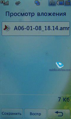 ДиктофонКак ни странно, но это одна из немногих моделей, выпущенных за последний год, которая не позволяет записывать разговор на диктофон. Активировать диктофон можно только через меню, при этом если воспользоваться многозадачностью и зайти в главное меню, пытаясь запустить диктофон, вы получите предупреждение о том, что надо прекратить телефонный разговор. Настройки диктофона включают в себя выбор длительности времени записи – для MMS, минута или неограниченное, а также качество записи – нормальное, хорошее или отличное. Выбрать формат записи WAV или AMR нельзя. Диктофон всегда записывает в формате AMR. По умолчанию для записей используется память телефона, и только после завершения записи ее можно перенести на карту памяти. Готовый файл можно отправить в сообщении или через электронную почту, Bluetooth, а также использовать его в качестве мелодии вызова. Качество записи среднее и практически не зависит от выбранного качества в настройках. На расстоянии около трех метров из соседней комнаты запись Земфиры хоть и слышна, но далека от того, чтобы назвать ее удовлетворительной.
