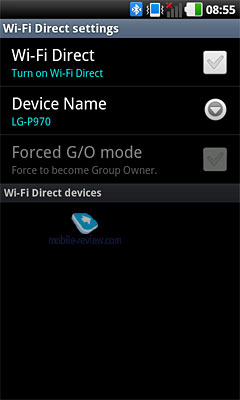 WiFi Direct is a new protocol to replace Bluetooth or compete with its third incarnation (which also uses WiFi n to transfer large files). One of the first models on the market to support this feature is LG Optimus Black. Its proliferation will make this service more popular, but so far I had to use 2 identical models for testing. In WiFi settings select WiFi Direct and the phone will start searching for devices around. Choose an appropriate device, activate the connection and you are done. Now in the file manager you can view files of the other device and transfer them. Within seconds large files are transferred from one phone to another. Back to the table of contents >>> CameraA 5 MP camera has a LED flash. The frontal camera boasts a record breaking 2 MP. Settings for the main camera are numerous. Face Tracking, ISO selection and macro mode are supported among other things. ![]() ![]() ![]() ![]() The main issue is connected with the fact that you cannot disable the shutter sound. It is quite loud at all times, which is a disadvantage here as many handsets allow disabling the feature. Despite the presence of the autofocus it is still difficult to choose the object to focus on from the screen. You have to keep a finger on the screen for more than a second and the focus area is large if to judge by the focus frame on the screen. There is no dedicated camera button. In settings you can go for different types of focus - auto, macro and fixed. Image size varies: