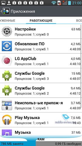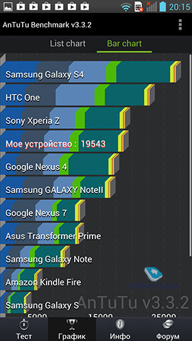 В среднем, устройство работало около 15 часов (яркость – 30 - 100): 15-20 минут разговоров в день, отправка 20 текстовых сообщений, 5-7 часов серфинга интернета (3G-соединение). Результаты Antutu Tester:
