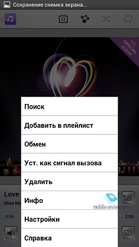 В аппарате присутствует GPS gpsOneGen 8A с Glonass. Для навигации используются «Карты» (Google Maps), «Локатор» и «Навигатор». Поиск спутников осуществляется в «холодном» старте за 30-40 секунд, в «горячем» — менее пяти секунд. Чувствительность мне показалась невысокой. МультимедиаМузыкальный проигрыватель. В плеере можно упорядочить композиции по исполнителям, альбомам, песням и папкам. При проигрывании музыки на экране отображаются: огромная обложка альбома, имя исполнителя и название альбома, ниже – кнопки управления плеером. В настройках: поиск, добавить в избранное, SmartShare, добавить в плейлист, удалить, обмен (заметка, Bluetooth, Gmail, Skype, SMS/MMS), установить как сигнал звонка, информация и настройки. Настройки: