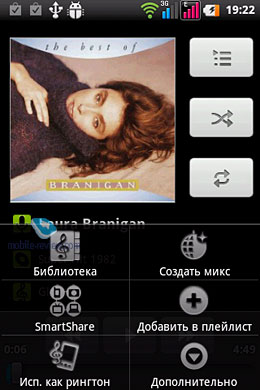 МультимедиаМузыкальный проигрыватель В плеере можно упорядочить композиции по исполнителям, альбомам, песням и плейлистам. При проигрывании музыки на экране отображаются обложка альбома, имя исполнителя и название альбома, ниже – кнопки управления плеером. В настройках: добавить в плейлист, библиотека, настройки, SmartShare, удаление, использовать как рингтон, обмен (по Bluetooth, gmail, sms, электронной почте). В отличие от топовых смартфонов LG, в бюджетном Link Dual отсутствует эквалайзер.