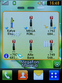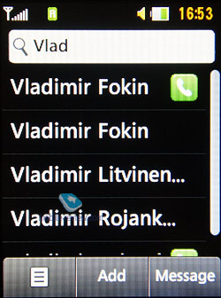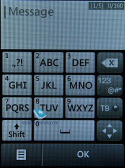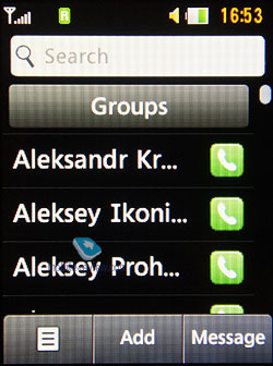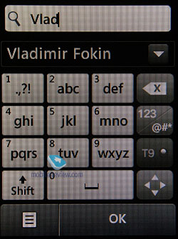 Меню аппарата полностью оптимизировано для работы без использования стилуса. Все иконки и пункты подменю крупные, так что попасть в них пальцем не составляет труда. Пролистывать страницы можно или с помощью боковой полосы прокрутки, которая тонка и не очень удобна в работе, или же просто быстро проведя по экрану в любом месте. При запуске Java-приложения в нижней части экрана появляется виртуальный навигационный блок, который можно переключить на виртуальную цифровую клавиатуру. В меню T500 можно выбрать, для каких Java приложений отображать навигационный блок, а для каких нет. Ввод текста в аппарате может осуществляться тремя способами. Для пользователя доступен рукописный ввод. Распознавание текста работает хорошо как для русского, так и для английского языка, единственное, что все же такой метод ввода в аппарате не очень удобен. Более удобен ввод текста с помощью виртуальной клавиатуры, которая схожа по раскладке с обычной аппаратной клавиатурой. Так, на экране отображаются 6 клавиш, на каждую из которых назначено несколько символов, переключение между ними осуществляется повторными нажатиями на клавишу. Виртуальные кнопки достаточно большие по размеру, так что ввод текста не вызывает проблем, да к тому же, в телефоне имеется предикативный ввод текста T9, который еще больше облегчает работу. Есть также в телефоне и полноэкранная qwerty-клавиатура, которая в связи с отсутствием в аппарате датчика движения включается вручную. В работе она удобна, клавиши достаточно крупные, при нажатии появляются визуальные подсказки, чтобы предотвратить ошибочный набор. Телефонная книга. В аппарате может храниться до 1000 контактов. Для каждого контакта можно записать имя и фамилию, до пяти телефонных номеров с выбором типа номера, два адреса электронной почты, почтовый адрес, название компании, должность, а также небольшую текстовую заметку. Кроме этого, возможно ввести дату рождения, которая будет автоматически перенесена в календарь телефона. Также контакту можно присвоить изображение, сигнал вызова, а также поместить его в три группы. Изначально в телефоне существует 5 групп, но пользователь может создать дополнительные группы в любом количестве. Для каждой из групп возможно записать ее название, а также присвоить сигнал вызова. В телефонной книге можно выбрать сортировку контактов либо по имени, либо по фамилии. Также возможно настроить отображение контактов по отдельности из памяти телефона и SIM-карты или их одновременное отображение. Поиск в телефонной книге осуществляется по первым буквам. Есть в телефоне и функция быстрого набора 8 номеров. Контакт, помещенный в ячейку быстрого набора, будет отображаться вместе с миниатюрой фотографии (если она, конечно, была присвоена контакту), а также в нижней части ячейки будут отображаться первые буквы имени (всего помещается 9 букв). Есть возможность сделать резервную копию телефонной книги на карту памяти. При входящем и исходящем вызове изображение, присвоенное контакту, отображается примерно на половину экрана. Имеется интеллектуальный ввод номера, который по введенным первым цифрам предлагает варианты из телефонной книги или ранее набранных номеров.