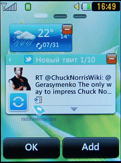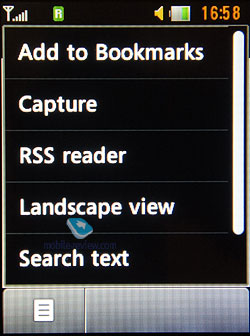 ![]() Браузер. В аппарате установлен достаточно хороший браузер, который позволяет просматривать не только wap, но и обычные интернет-страницы. Масштабировать страницы при просмотре в браузере можно просто прикосновением к экрану. Переворачивать изображение в альбомный режим, при отсутствии датчика движения, можно лишь через меню. Также в браузере предусмотрена загрузка RSS-каналов.