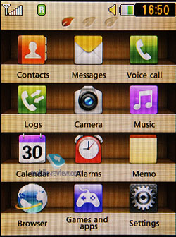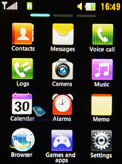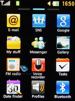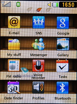 ![]() Главное меню в телефоне делится на три вкладки, переход между которыми возможен с помощью пролистывания. В каждой вкладке пункты меню отображаются в виде матрицы 3х3, их можно сортировать на свое усмотрение. Подменю в телефоне представлено в виде вертикальных списков. Главное меню аппарата анимировано, а перемещения по нему происходят без каких-либо видимых притормаживаний.