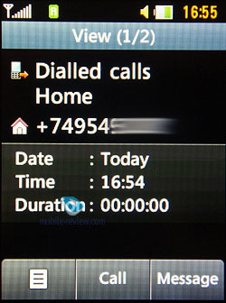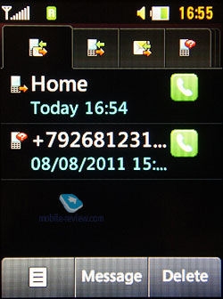 Список вызовов. В аппарате имеются списки входящих, исходящих и пропущенных вызовов, а также полученных/отправленных сообщений, кроме этого, имеется общий список для всех вызовов и сообщений. Максимально в телефоне может храниться информация о 100 вызовах. Вызовы на одинаковые номера объединяются только в том случае, если они были сделаны подряд, тогда рядом с номером (именем) появляется число сделанных попыток, а в детальной информации можно увидеть время и дату для каждого из звонков. Для каждого вызова отображается имя абонента (если оно есть в телефонной книге) и дата, а в детальной информации появляется номер абонента, время вызова и его продолжительность. В меню настроек можно найти счетчик вызовов и счетчик данных.