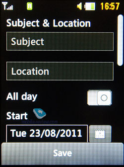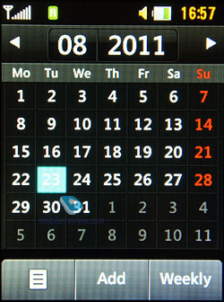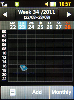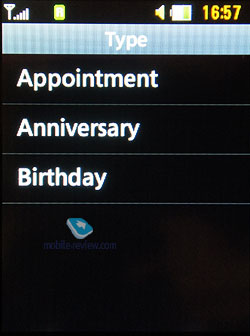![]() Органайзер. Здесь располагается календарь с возможностью просмотра за месяц, неделю и день. В календаре можно создавать до 100 событий, для каждого возможно выбрать категорию, дату и время начала и окончания, записать заметку и адрес. Также возможно включить оповещение о наступившем событии, а также активировать его повтор. В телефоне может храниться до 100 задач, для каждой из которых записываете тему, выбираете дату, делаете текстовую заметку и выставляете приоритет.