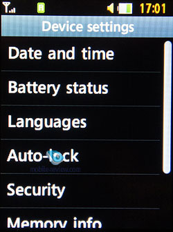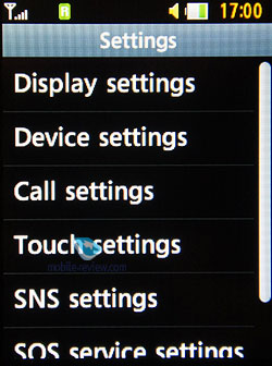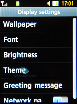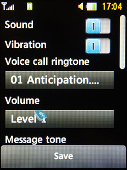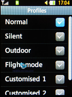 Настройки. В аппарате 7 профилей, полностью настраиваемых пользователем. Здесь вы можете выбрать любую мелодию сигнала как для голосового вызова, видеовызова, так и для сообщения. Здесь же возможно настроить громкость сигналов, а также включить вибровызов, который будет работать одновременно с мелодией. Для экрана возможно выбрать в качестве обоев любую картинку, как из предустановленных, так и из пользовательских. Кроме этого, в настройках можно выбрать размер шрифта меню, а также одну из двух тем оформления меню.