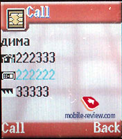 To get in the main menu, it is necessary to press the left key under the screen. The main menu is realized by animated icons, the selected item is shown in the center with corresponding inscription. To move through the menu it is possible with the help of navigation key, to enter the menu you should press OK key. There's no fast navigation through the menu. All submenus are realized as lists, all is habitual. To exit the upper level you should pressing the right soft key, pressing of Release key or C won't result in anything. Now try to remember, how does realize the exit to the upper level in your device? The right soft key serves as duplicating, if at all it has similar function. In standby mode the right soft key is used for fast profile change, it's interesting decision. But if to glance over the use of two keys it becomes clear, that the organization of their interaction in phones from other manufacturers is much better, but not so original. How can you look through the call log? Intuitively clear answer is unique - pressing call send key. But developers from Maxon think differently, for them, it's more natural pressing navigating key down. Phonebook. The phonebook is called by moving the navigation key to the left. You can store up to 250 entries in the memory, and for each name it is possible enter such information as Name, Surname, three phone numbers, postal address, postal code, city, and group. Input is possible both in English, and in Russian languages, the device supports predictive text input. And here we face with the most simple and obvious realization of input. Having highlighted the item necessary to you, for example, Surname field you cannot begin input at once, you need to confirm the action. And the same happens with each field, the functional rich of phonebook turns into mockery. In the numbers list there is search by letter, the simultaneous displaying of numbers fro Sim-card and from phone is impossible, you should switch between such types of displaying. ![]()