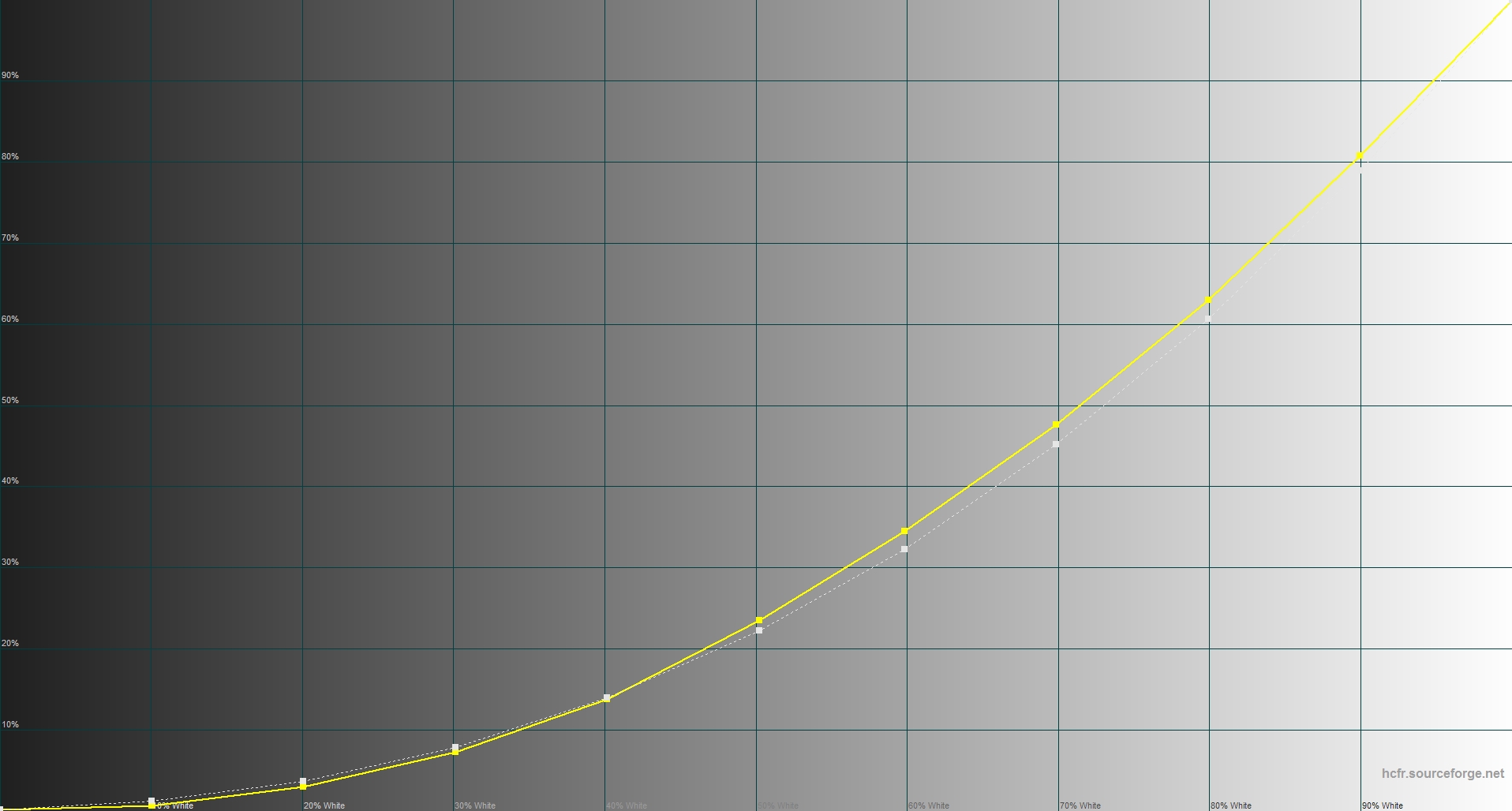 Максимальная яркость белого цвета – 400 кд/м2 (официальные данные – 380), черного цвета – 0,59 кд/м2. Контрастность – 677:1 (официально – 1000:1). Белая линия – та цель, которой мы пытаемся достигнуть. Желтая линия – фактические данные экрана. Вы можете видеть, что мы находимся практически непосредственно под целевой кривой при значениях от 0 до 100%, что означает, что при каждом значении изображение недостаточно подсвечено. Желтая линия – фактически среднее количество красного, зеленого и синего. Среднее значение гаммы – 2.12. Судя по графику уровней, синий цвет в избытке, а красный в недостатке. На минимальной яркости температура ближе к 7800 К, в среднем – 7200 К Судя по диаграмме, полученные данные не превышают треугольник sRGB, особенно в зоне зеленого, красного и синего цветов. Многие точки серого разместились в радиуса DeltaE=10, что свидетельствует о том, что в серых цветах не будут присутствовать другие оттенки.