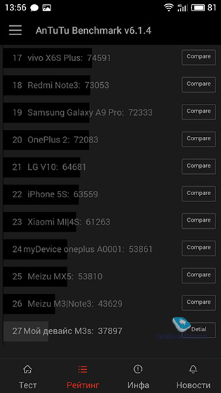 Производительность и программная платформаВ Meizu M3S mini используется чипсет MediaTek MT6750. Информация о чипе появилась еще в начале этого года. Этот процессор был создан как недорогое решение с LTE Cat 6, а также VoLTE, ViLTE и VoWiFi. Чип 8-ядерный: один кластер состоит из четырех ядер Cortex-A53, работающих на частоте 1 ГГц, и предназначен для несложных задач; второй кластер состоит из четырех производительных ядер Cortex-A53, работающих на частоте 1.5 ГГц, предназначен для требовательных приложений. За графику отвечает ARM Mali-T860MP2 с поддержкой OpenGL ES 3.1, OpenCL 1.2 и DirectX 11.1, способен работать на частоте до 700 МГц. В MT6750 он работает на частоте 650 МГц. При нагрузке процессора корпус греется не так сильно (максимум 41–42 градуса), в обычном состоянии (музыка, фотокамера, картинки, использование сети) – 32–35 градусов. Смартфон очень быстрый, никаких микролагов или подтормаживаний системы. В компании Meizu оболочку Flyme отточили неплохо, правда, и функций в ней не так много. С игрушками не все однозначно: Unkilled показывает нестабильные 13–22 fps, Dead Trigger 2 – стабильные 30 fps, Real Racing 3 – в среднем, 27, но кадры «прыгают» от 19 до 38 fps. Как-то так…