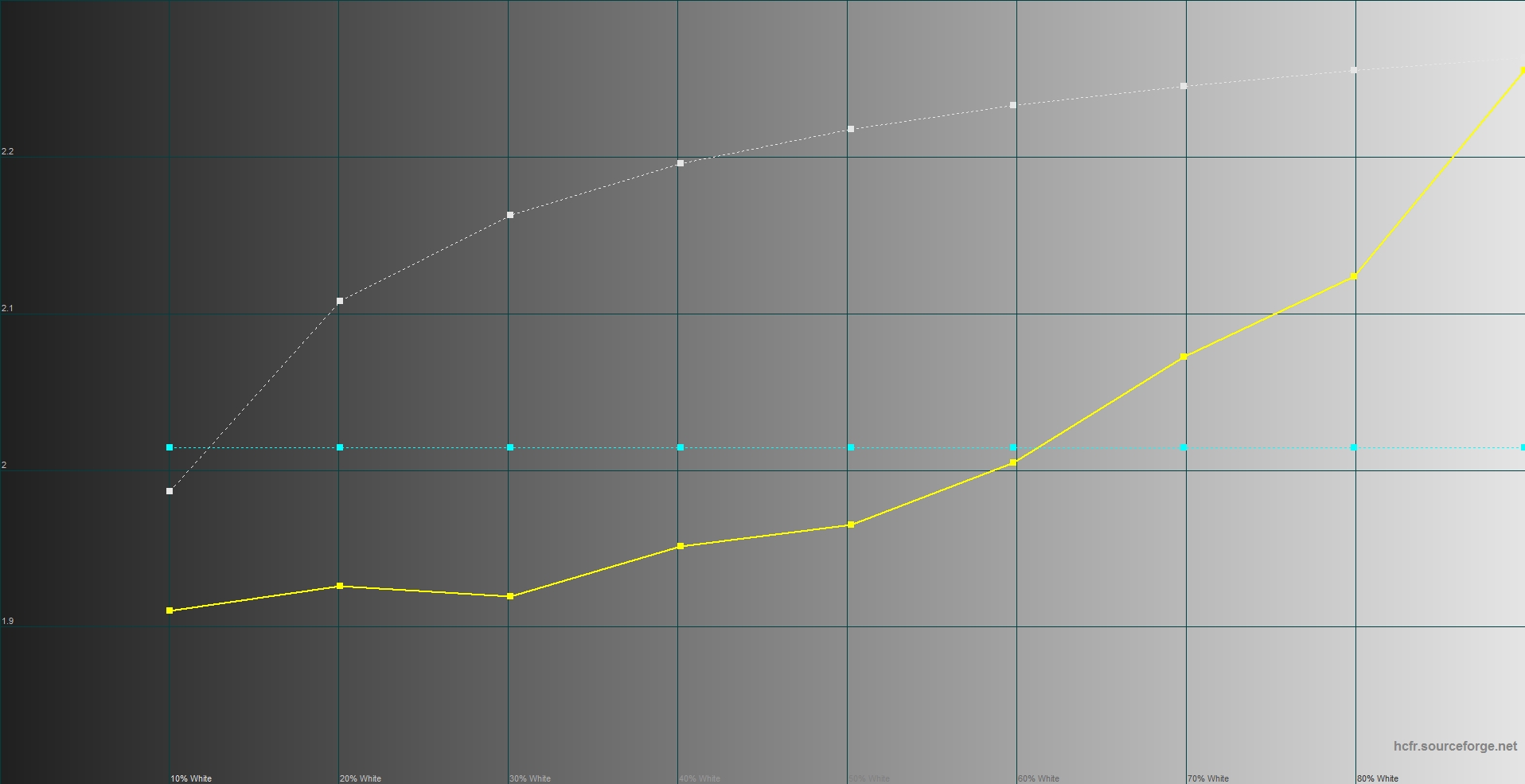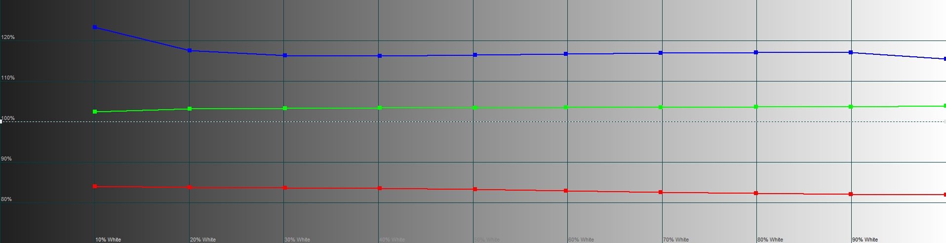 Meizu M5 и Xiaomi Redmi 4A ДисплейВ Meizu M5 используется экран, диагональ которого составляет 5.2 дюйма. Напомню, что в M1/M2 Note диагональ 5.5", в MX4 – 5.36", а в MX4 Pro – 5.5", в Pro 5 - 5.7", в Pro 6 – 5.2", в M3S mini – 5 дюймов. Физический размер экрана M5 – 65х115 мм, рамка сверху – 16 мм, снизу – 15.5, справа и слева – чуть менее 4 мм. Присутствует антибликовое покрытие. Разрешение дисплея Meizu M5 – HD, то есть 720х1280 точек, плотность – 282 пикселя на дюйм. Матрица выполнена по технологии IPS без воздушной прослойки. Максимальная яркость белого цвета – 468 кд/м2 (официальные данные – 380), черного цвета – 0,42 кд/м2. Контрастность – 1100:1 (официально – 1000:1). Белая линия – та цель, которой мы пытаемся достигнуть. Желтая линия – фактические данные экрана. Вы можете видеть, что мы находимся над целевой кривой при значениях от 0 до 100%, что означает, что при каждом значении изображение пересвечено. Желтая линия – фактически среднее количество красного, зеленого и синего. Среднее значение гаммы 2. Судя по графику уровней, синий цвет в избытке, а красный в недостатке. На минимальной яркости температура ближе к 8500 К, в среднем – 8000 К. Судя по диаграмме, полученные данные превышают треугольник sRGB, особенно в зоне светло-зеленого цвета. Многие точки серого разместились вне радиуса DeltaE=10, что свидетельствует о том, что в серых цветах будут присутствовать другие оттенки. Углы обзора максимальные, картинка почти не искажается, по крайней мере, чисто визуально. Если сравнивать экран M5 и M3s mini, то у последнего более точно настроены цвета, но углы обзора с искажениями.