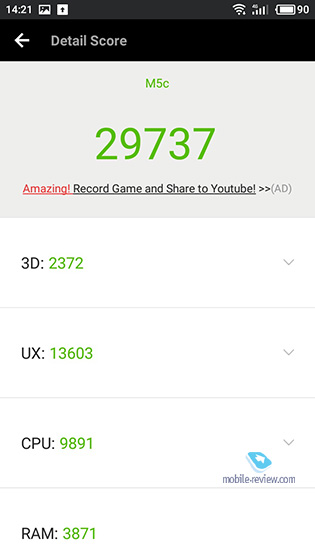 В Meizu M5c чип совсем бюджетный – MediaTek MT6737 (даже без индекса T): всего лишь 4 ядра ARM Cortex-A53 1,3 ГГц, а графика такая же – ARM Mali-T720. В тесте набирает 29 737 баллов.