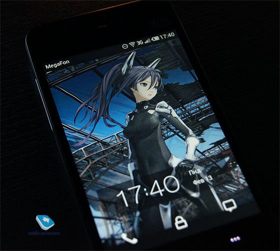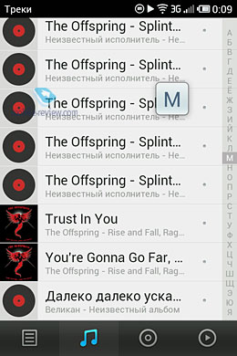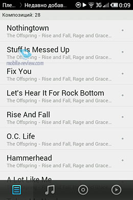 В нижней области экрана - фиксированная панель с тремя иконками: телефон, браузер, сообщения. Поменять их нельзя. Экран блокировкиЭкран блокировки - как в Meizu M9. Здесь отображаются текущее время, системная строка сверху и панель с тремя иконками внизу. Если потянуть за центральную, дисплей разблокируется, и вы попадаете на главный экран. Если потянуть за левую, попадете в меню с историей звонков, за правую – в окно со списком текстовых сообщений. Изменить набор иконок (как в новых версиях Sense, например) нельзя. Нажатие клавиши «Меню» на экране блокировки вызывает панель управления музыкой.