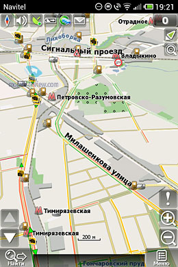 Коротко расскажу о работе «Навител Навигатор» в Meizu MX. После первого запуска были включены все онлайн-сервисы: пробки, события, обмен данными, погода и «online-информация». На их работу съедается около 1-2 МБ трафика, что не так и много. Поиск в программе доступен по разным типам данных, например, по адресу. Нужно выбрать город (обычно он уже выбран автоматически), улицу и дома. При вводе букв лишние символы отсеиваются, так что когда я набираю адрес вида «Тверская», с каждой следующей введенной буквой вижу все меньше доступных вариантов, это удобно.