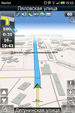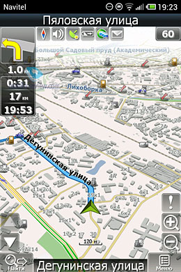Построение маршрута занимает менее секунды, столько же времени потребуется и для перестройки маршрута в случае возникновения затора или другой неприятной ситуации. Есть два режима отображения карты, трехмерный и плоский (2D), второй мне кажется более удобным. Можно выбрать цветовую схему (ночь и день) вручную или оставить их переключение на совесть режима «авто». При ведении по маршруту программа оповещает обо всех маневрах и важных точках пути голосовыми подсказками.