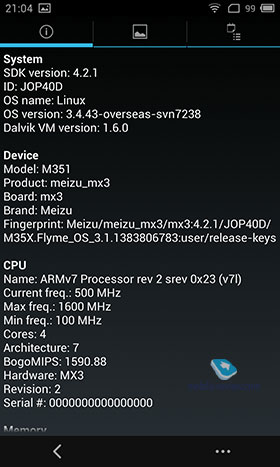 Программная платформаУстройство работает на операционной системе Google Android версии 4.2.1. Уверен, что скоро будет доступно новое ПО, которое будет включать в себя не только устранения ошибок камеры, но и новую версию системы (4.3). Об Android 4.4 говорить пока рано, скорее всего, MX3 его получит ближе к февралю-марту.