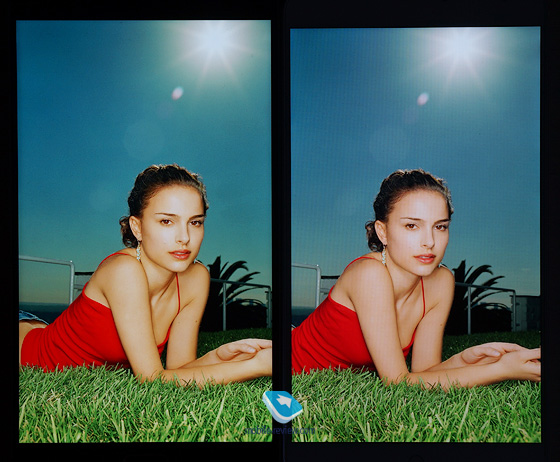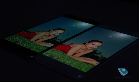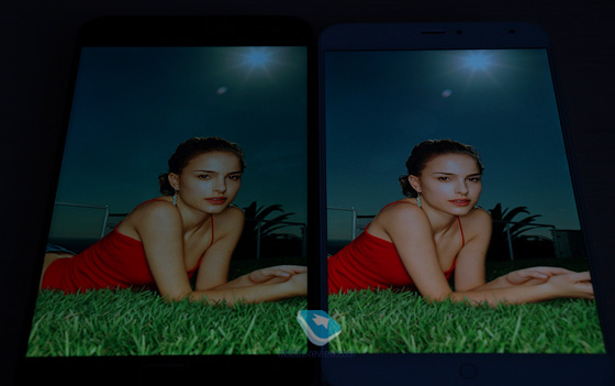 Если сравнивать по фотографиям экранов MX4 Pro и MX4, то насыщенность цветами выше на MX4 Pro, углы обзора тоже больше на MX4 Pro, однако под наклонами картинка на Pro-версии немного желтит и фиолетит. Изображение на MX4 практически не искажается. Экраны Meizu MX4 Pro и MX4 (справа)
