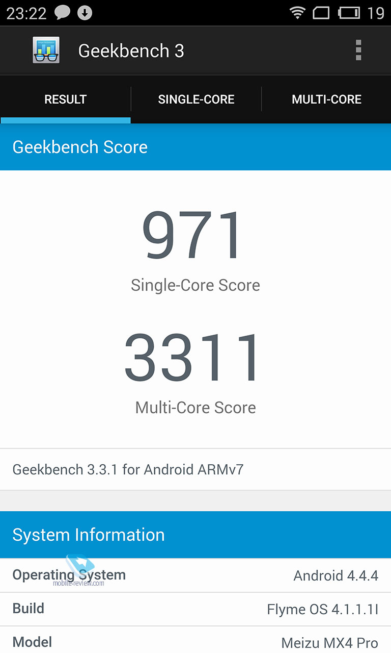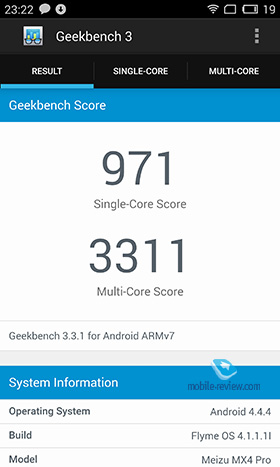 На данном семпле Antutu «крашится» в конце тестирования. Скорее всего, «сырая» прошивка. Да и в целом, можете заметить, что MX4 круче, если учитывать количество «попугаев» в бенчмарках. В общем, MX4 Pro ведет себя немного шустрее MX4, в основном это заметно на скорости прорисовки анимации и обработке информации в памяти – программы открываются без загрузки. На MX4 Pro игры идут все без тормозов. На MX4 были проблемы с GTA SA.