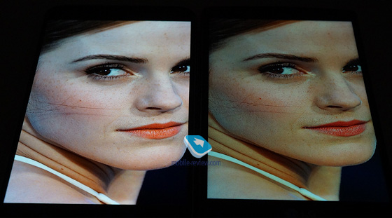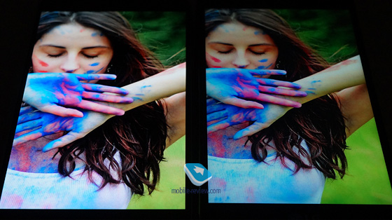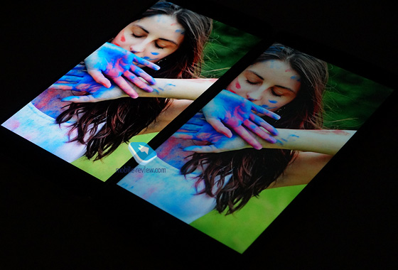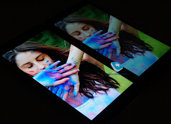 Углы обзора максимальные, под определенными наклонами экрана картинка слегка зеленит. Сравнение экранов (Meizu MX5 – слева, LG G4 – справа)