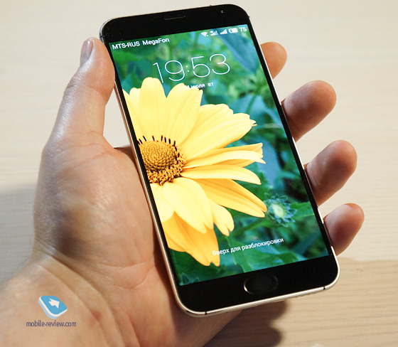 Естественно, есть фронтальная камера. Она справа. Под дисплеем располагается механическая кнопка, совмещенная с дактилоскопическим сенсором. Назвали кнопку mTouch 2.0. Она плоская, чуть утоплена в корпус. Выполняет роль выхода на домашний экран при нажатии, при касании – «Назад», при длительном удержании блокирует экран. Цитата из официального источника: «Весь модуль был переработан, результатом чего стали более высокая скорость распознавания, улучшенный комфорт при использовании и более удобный дизайн. Абсолютно новая кнопка-капсула, содержащая в себе различную функциональность, прекрасно гармонирует с единой конструкцией корпуса телефона. Только путем непрерывного совершенствования, мы можем создавать телефоны, которые достойны вашего внимания.