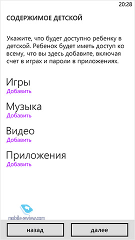 ![]() Память телефона. В WP8 поддерживается работа с внешними картами памяти, поэтому вы можете выбрать носитель, на котором хотите хранить свои данные и медиафайлы. ![]() Детский уголок. При желании вы можете создать специальный раздел для ваших детей, где будут собраны все необходимые для них приложения и игры. Детский уголок включается в настройках. После его активации вам достаточно потянуть экран блокировки влево, чтобы войти в него.