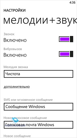 Мелодии и звуки. Здесь настраивается звук уведомлений и мелодия звонка (теперь поддерживаются и ваши собственные мелодии, для этого надо залить их в папку Ringtones), включается/отключается виброзвонок, а также выбираются действия, для которых будут включены звуки.