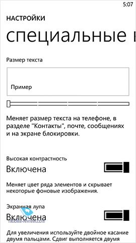 Специальные возможности. Видимо, раздел предназначен для людей с плохим зрением. Здесь можно изменить размер шрифта (он будет сменен для SMS, почты, контактов и экрана блокировки). Высокая контрастность включает черно-белую тему, а режим лупы позволяет увеличивать масштаб с помощью жестов двумя пальцами (у меня эта функция не работала).