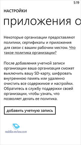 ![]() Поиск телефона. Позволяет сохранять местоположение вашего телефона, а так же присылать push-уведомления через сайт WindowsPhone.com. ![]() Приложения организаций. Как я понял эта функция для тех, у кого WP8 используется в качестве корпоративного смартфона. ![]() Во втором экране можно настроить параметры некоторых программ. В частности, один пункт настроек для игр (подключаться или нет к сервису Xbox live), два пункта настроек для браузера IE, настройки сообщений и всех хабов: People, Office, Phone, Pictures, Music. О самих настройках для каждого хаба мы уже говорили выше.