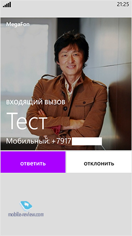Адресная книга делает то же самое, только вы ищете карточку абонента сами, а не сразу открываете ее. После ярлыков быстрого вызова на Android такое решение выглядит устаревшим. ![]() Плитка «Телефон» открывает историю всех звонков, тут же можно сразу набрать абонента, который вам недавно звонил. ![]() При вызове абонента вы видите его номер и время звонка. Фотографии контакта нет (даже если она назначена!). Это огромный просчет, который меня очень расстраивает, непонятно, зачем нужно было так делать.