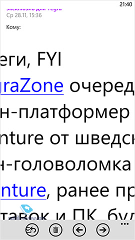 ![]() Письма в списке можно выделять. Для этого нужно поднести палец к левому краю экрана и аккуратно нажать на область слева от необходимого письма. Как только выделено одно письмо, возле каждого появится квадрат с возможностью поставить там галочку, то есть выделить и его. Кроме этого, можно просто нажать кнопку внизу экрана для вызова режима выделения писем. Выделить все сообщения разом нельзя. Выделенные письма можно отметить как прочитанные или непрочитанные, установить, или снять для них флажки, а также поставить отметку «выполнено» (справа от имени и темы письма появится галочка). ![]() Откроем одно письмо. Сверху крупным-крупным шрифтом написаны имя и фамилия его отправителя. Как правило, эти данные даже не помещаются на экран, и прочесть фамилию неизвестного человека вы до конца не сможете. Например, если мне напишет Константин Константинов, то я увижу как в общем списке сообщений, так и в открытом сообщении что-то вроде Константин Конст. ![]() Ниже имени и фамилии - строка с темой, а далее - дата получения письма. Еще ниже - адресат, то есть вы и другие люди, если письмо отправлено не только вам или в виде рассылки. Дальше идут вложения, если таковые есть, и уже затем текст. ![]() Неподготовленного читателя здесь ждет неприятная новость. Впрочем, она для всех неприятная. В WP8 можно масштабировать текст письма, как и в любой другой системе. Делать его мельче или крупнее. Однако, в отличие от других систем, в WP8 увеличенный текст не выравнивается по ширине экрана заново. Вы верно поняли меня, если вы «укрупнили» текст письма в почте, будьте добры пользоваться горизонтальным скроллом, чтобы прочесть его. ![]() Читать письма можно как в вертикальной ориентации экрана, так и в горизонтальной. Вложения раскрываются, если кликнуть по серой подписи «вложения». Клик по названию вложения начинает его загрузку. Состояние загрузки отследить нельзя, но то, что вложение загружается, вы поймете по наличию под ним подписи «Cancel». Выбрать для загрузки вложений определенное место нельзя, здесь нет понятия папок и просматриваемой файловой системы. Соответственно, чтобы посмотреть загруженное вложение, вам нужно открыть письмо с ним и там уже кликнуть по вложению. В системе не предусмотрено инструмента для просмотра всех загруженных вложений или какого-нибудь журнала загрузок для почтовых аккаунтов. Загруженное вложение от еще не загруженного можно отличить по иконке. У незагруженных она общая, в виде скрепки, у загруженных – по типу файла. Кстати, WP8 не различает писем в формате html, то есть с картинками, и писем с вложениями. То есть, в общем списке писем вы будете видеть иконку скрепки не только для писем с вложениями, но и для писем в html-формате, ведь там есть картинки, а это как будто вложения.