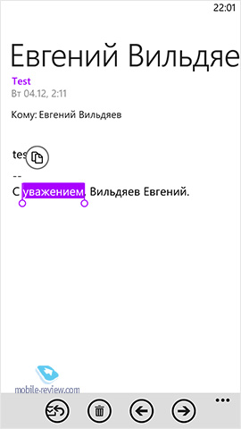 Поиск в списке писем ведется по имени, фамилии, теме письма, а также по телу письма (по всему тексту, а не только видимой в общем списке строке). ![]() Почтовый клиент без проблем отображает как стандартные текстовые сообщения, так и составленные с использованием html. В случае html для загрузки изображений нужно вначале кликнуть по любой картинке внутри письма, после этого они подгружаются. ![]() Работа с текстом внутри письма В Windows Phone 8 поддерживается функция copy-paste. То есть, текст из письма (и не только) можно скопировать и затем вставить в другое место, например, в документ или в адресную строку браузера. Выглядит это так: при клике на слове появляется иконка копирования выделенного текста в буфер обмена, слева и справа от слова - стрелочки, перетягивая которые можно выделять другие слова или целые куски текста и копировать их.