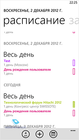 В горизонтальном режиме клавиатура становится чуть шире, но далеко не во всю ширину экрана. То есть, в WP8 нет особой разницы между ландшафтной и портретной клавиатурами, они не различаются по удобству ввода текста на них. ![]() ![]() При вводе буквы на клавиатуре она отображается во всплывающем поле над самой клавишей, поэтому, даже закрыв кнопку пальцем, вы всегда видите, какую именно букву вводите в данный момент. Нажатие на клавишу сопровождается звуком, вибрации нет. Для разных полей ввода клавиатуры немного различаются. Например, для текстовых сообщений слева от пробела - кнопка ввода улыбок, а при работе в браузере там же клавиша для быстрого введения «.com». При этом, если удерживать на кнопке «.com» палец около секунды, появится всплывающее меню, где можно выбрать доменную зону: .org, .edu, net. Если удерживать палец в поле ввода на одном из слов, появляется курсор, с его помощью можно исправлять в словах ошибки или просто перемещаться между словами или фразами в уже написанном тексте, чтобы что-то добавить или исправить. ![]() В клавиатуре есть предикативный ввод, поддерживается и русский язык. При опечатках слова автоматически исправляются. КалендарьКалендарь можно представить картинкой-блоком на главный экран, он будет занимать всю строку, то есть два стандартных блока. Здесь отображаются текущий день недели и дата, а также ближайшее событие, если таковое есть. ![]() В календаре вы видите список событий на текущий день, отсортированных по времени, либо список событий на ближайший день, на который они есть. В общем списке событий отображаются их названия и место проведения, а также время. Справа от каждого события - цветная метка, которая обозначает принадлежность события к одному из календарей, которые вы синхронизируете. Поддерживается нативная синхронизация с календарем Facebook, совместные мероприятия из общей комнаты также отображаются.