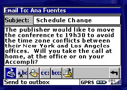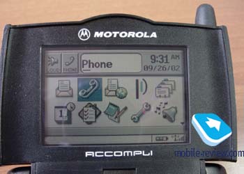 We have already paid your attention that under phone weight we meant only a weight of communicator with a battery. The standard kit includes also a portable handsfree, Plug-in Speakerphone and a holster. Besides, you can find there a desktop cradle, RS232 adapter and CD with a software. At first sight this device offers standard possibilities: viewing of PowerPoint 2000 presentations, sending and receiving e-mail (POP/SMTP) and others. But it works under the latest Wisdom™ OS (version 5) from Motorola. Using of own OS allows to reduce effectively the size of execution code of applications and OS. On the other hand, this OS doesn't support some file formats, for instance, graphics recorded in JPG. But a user can convert all jpg files to ROB format. A calendar and organizer support data exchange with such applications as Microsoft Schedule+ 7.x, Microsoft Outlook 97/98/2000, Lotus Notes 4.5, 4.6 & 5.0, Lotus Organizer 5.0, 6.0, 97, GS/4.0. You can also send some of the notes, exchange business cards via IR-port. Synchronization software can be used in Microsoft Windows 95/98/2000 and Microsoft Windows NT 4.0 environments. Wireless synchronization is not supported.