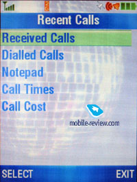 Call log. The phone has a list of received calls; it includes the missed ones as well. You can also see the list of the 10 last dialed numbers; you can access it by pressing the Call button. Everything is rather simple and traditional, nothing special at all. Each entry features the date and time as well as the duration.