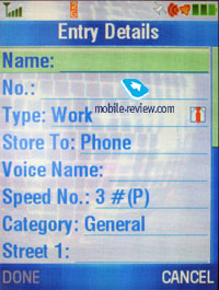 Extra fields allow entering plenty of data for a name - Nickname (used in ICQ-copying programs), address fields (two fields for a street, fields for a city, state, index, country), birth date fields (still no memo) . You are free to choose the style of displaying entries in the phone book: either names with assigned images, or only names, you can also personalize the entry sorting style (quick dial number, name, e-mail address). Voice dialing can be setup as well; it works fine in various conditions.