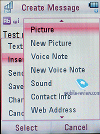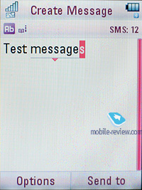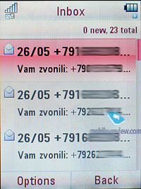 In the general list, you can mark either an individual entry or a couple at a time (not more than 100, however). All of them can be transferred to another device via Bluetooth (bulk sending of all entries is not supported). The interesting thing is the ability to lock some contacts, so they won’t get deleted upon synchronization (you have enabled contacts replacement option), or from editing contacts by malefactors. The handset supports remote synchronization of the phonebook with Exchange ActiveSync server. It is enough to set the type of synchronization and handset mode and enter server settings. Overall, the phone book can store not less than 1000 entries with fully filled-in fields. Back to the table of contents >>> MessagingThe number of messages stored in the handset depends on the volume of free memory, but in practice, it seems to be nearly unlimited. This platform employs a standard structure of folders, enabling you to create your own folders. Next to each folder is the number of messages stored in it, and the number of unread messages. While looking through the list of every folder, this data is also shown on top of the screen. The process of handing SMS/MSS messages is unified as much as only it’s possible. When creating a message, you cannot see any difference between those two types of messages. But should you paste a video or photo in the text, the “SMS” will instantly turn into a “MMS” in the service line (message type can be forcibly changed). It is quite logical, though this feature is designed mainly for unsophisticated users, just like the platform itself. While texting, you can see number of symbols entered in the service line above. Support for EMS is onboard, however there are no smiles or pictures prepared exclusively for this standard available. You can make use of the default templates, they are divided into two groups: for SMS and MMS respectively. For text messages, there are delivery report and reading confirmation at your disposal, as well as message priority settings. If a message couldn’t be delivered instantly, for example, you were out of network coverage, then the platform will postpone sending automatically, so unlike other phones, here you should not worry that your message won’t reach the recipient. However, this seemingly handy feature occasionally causes some incidents – for instance, I was completely out of luck once, being unable to send a message for almost 20 hours (the handset was turned off or out of network coverage). And when it actually made its way to the recipient’s phone, it was already too late (really, how could we possibly meet when my plane had already taken off?).