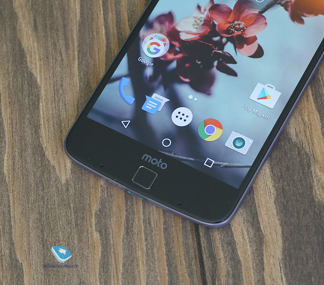 Внешний вид, материалы, управляющие элементы, сборкаПервое, на что сразу обращаешь внимание при взгляде на Moto Z, — «второй подбородок» из сканера отпечатков пальцев и четырех «точек» (это датчики движения и два микрофона). Эта нижняя панелька выглядит странно и немного смешно. Многие из тех, кому я показывал аппарат, отмечали, что он похож на смайлик «:о». Меня тоже напрягало такое нерациональное использование пространства, но буквально через полчаса ты совсем перестаешь обращать внимание на этот элемент.