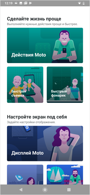 С точки зрения мультимедиа мне этот аппарат понравился, он хорошо проигрывает музыку, и, сравнивая его с одноклассниками преимущественно китайского происхождения, я отдаю предпочтение ему, звук воспроизводится чище и лучше. В приложении «Мото» вам показывают, как движением кисти можно активировать камеру, как можно записать голосовую метку, чтобы активировать телефон, а также знакомят с ночным режимом.