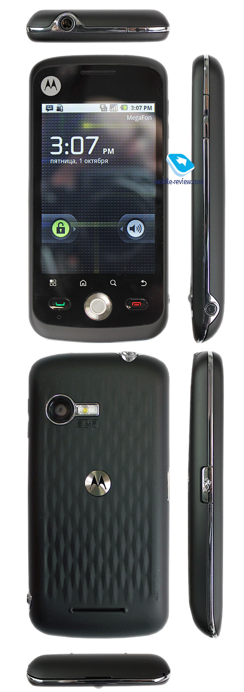 ПозиционированиеВ Motorola сделали ставку на Android и хотят играть первую скрипку на этом рынке. Проблема заключается в том, что важно не только представлять флагманские устройства, модели, которые задают стандарт, такие как Milestone/Droid или Droid2, но представлять и массовые решения. Для Motorola этот сегмент рынка традиционно слаб, а тратить время на разработку таких устройств при их маленьком объеме продаж и небольшом интересе со стороны операторов точно не стоит. Решение, как обычно, кроется в ODM-разработках, когда компания-партнер предоставляет железо, а Motorola создает свой дизайн и настраивает все внутри сообразно своим представлениям. В качестве партнера для модели Quench выбрали Foxconn. Аналогичный аппарат от Foxconn выходит для Gigabyte, это модель Gsmart G1305. Вы можете посмотреть на внешность моделей, они очень сходны, хотя мне аппарат от Motorola приглянулся больше. ![]() Если описывать кратко этот сегмент телефонов на Android, то это бюджетные модели с самой небольшой стоимостью. До недавнего времени таких аппаратов практически не было, первой ласточкой стал HTC Wildfire, с ним и конкурирует вышедший позднее Motorola Quench. Также в конкуренты этой модели можно записать Samsung Galaxy 550/580, но у них продукт от Motorola выигрывает разрешением экрана. И это самая сильная сторона этой модели. В бюджетном сегменте для Android телефонов принято использовать экраны с низким разрешением, в этой модели убрали этот недостаток. И фактически создали очень привлекательное решение, которое можно смело рекомендовать как первый Android-телефон. Если уйти от рынка Android-решений, то модель выглядит крайне привлекательной и как недорогой смартфон для различных задач. Спокойный, выдержанный дизайн, отличное соотношение цена/качество. Этот телефон явно будет хорош для тех, кто тщательно выбирает себе аппарат и готов использовать его долгое время, не будет гнаться за всеми новинками. Понятно, что мы вряд ли получим обновления на 2.2 и последующие версии Android, но кому-то они не нужны. Дизайн, размеры, управляющие элементыОбычный моноблок черного цвета, лицевая вставка из пластика, прикрывающего экран, маркая, на ней легко остаются следы от рук. Боковые стороны и задняя часть аппарата бархатистые, его приятно держать в руках. Размер телефона - 114.9 x 56.8 x 12.6 мм, вес 117 грамм. Телефон хорошо ложится в руку, да и в кармане помещается без труда. ![]() На верхнем торце находится разъем 3.5 мм, а также кнопка включения/выключения. На левой боковой стороне за откидывающейся заглушкой – microUSB-разъем. На правой боковой стороне - спаренная клавиша регулировки громкости, а также кнопка камеры. ![]() ![]() Приятно, что не отказались от аппаратных клавиш посыла вызова и отбоя, по центру есть трекбол, он поддерживает и нажатия. Отличное управление для недорого телефона. Ряд сенсорных клавиш обычен для Motorola. ![]() ДисплейДисплей выполнен по емкостной технологии, поддерживается мультитач, например, на фотографиях он работает очень плавно, без каких-либо притормаживаний. Диагональ экрана 3.2 дюйма, разрешение экрана 320х480 точек (для сравнения в Galaxy 550 только QVGA), отображает до 262 000 цветов (TFT). На солнце экран выцветает, но текст остается читаемым. Если говорить о качестве картинки, то оно высокое по сравнению с конкурирующими моделями, дисплей явно выигрывает своим разрешением. И это его большой плюс. На экране помещается до 12 строк текста, пара служебны
