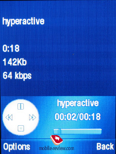 You can select the quality for video - good, better, the best. The maximum clip duration reaches 10 minutes. And it is curious that a camera interface differs from the video camera and represents another menu item. You can change the settings quickly, however the picture then takes only a part of the screen, which is caused by the clip resolution (low - 128x96 pixels, high - 176x144 pixels). Video quality is middling, you can record it without sound. And the frequency is 15 fps.