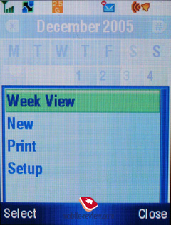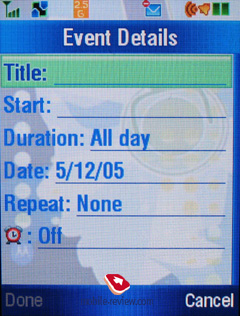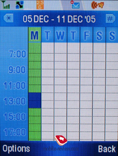 Dictaphone. You can create records from the stand by mode as well as during the talk. Dictaphone can record the whole dialogue. The maximum length for each entry - 60 seconds, however your interlocutor will hear the sounds (at first it's zoommer, followed by short beeps with a continuous interval). There is no possibility to keep more comments despite the dynamical memory present, only several records up to 60 seconds in duration (earlier the limit formed 120 seconds). The dictaphone is weak especially against a background of the rivals recording up to an hour of talks. In the listening mode a percent of the total time but not a reproduced time is shown, the discontinuity forms 5. That looks hardly comfortable since we all are used to representing record time and that seems logical. Organizer. You can view it monthly or weekly with breakdown for hours. You will see your appointments bind to a certain time of the day, it's convenient. Each entry can be assigned with a name, start time, length (measured in hours, the minimal amount of time - 30 minutes). Warning can be set in advance. Each entry can be reoccurred, this is a big plus.