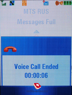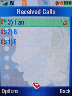 Call log. The phone has a list of received calls; it includes the missed ones as well, they may be distinguished by the absent tip. You can also see the list of 10 last dialed numbers; you can access it by pressing the Call button. Not only the caller's name but the type of the number is shown, if it is kept in the phonebook. Everything is rather simple and traditional, nothing special at all. Each entry features the date and time as well as the duration.